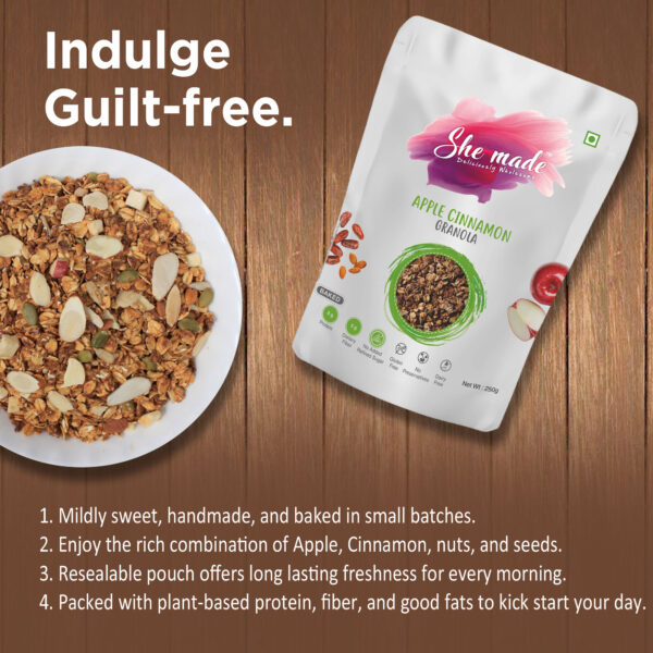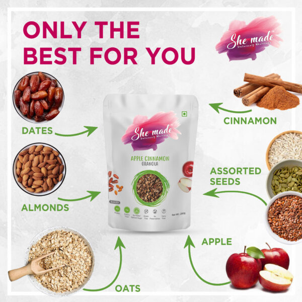 Treat your tastebuds with a bowl of Apple Cinnamon Granola that can be enjoyed with milk, yogurt, smoothies, or anything else you want. Sprinkle on top of the bowl along with your favorite mix of fruits, seeds, and nuts. Viola! Your gourmet treat is ready.