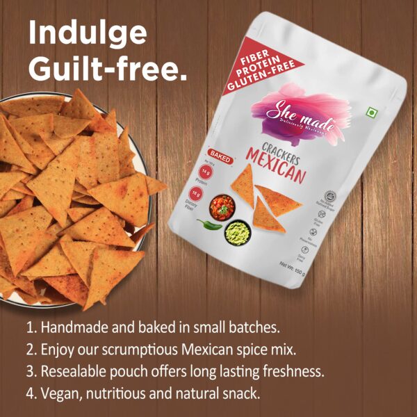 Relish the spicy & tangy Mexican crackers pack oodles of flavour in every bite. Our fresh and organic Mexican spice mix contains ingredients known to have antioxidants making these crackers completely healthy & diet-friendly.